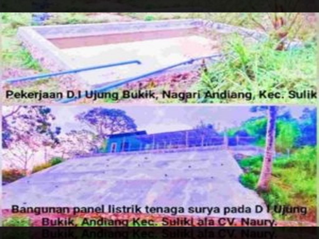 Dalam relisnya LSM AMPERA Indonesia, sebutkan dari pelaksanaan pekerjaan Bidang SDA PUPR Limapuluh Kota TA 2021 itu, yakni Rehabilitasi Jaringan Irigasi Permukaan (PDMIP) dari 8 program SDA PUPR TA. 2021 lalu, selain pekerjaannya diduga sarat KKN, juga berpotensi mubazir dan merugikan keuangan daerah, yakni D.I ( Daerah Irigasi ) Ujung Bukit, lokasi Andiang Kec. Suliki, yang dikerjakan CV. NAURY senilai Rp.1.379.975.780,70.