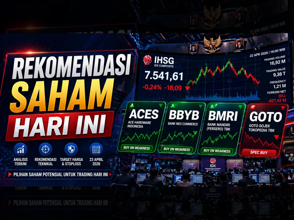 Jadi, daftar rekomendasi saham hari ini untuk 23 April 2026 yang paling banyak disorot adalah ACES, BBYB, BMRI, dan GOTO. Semuanya muncul di tengah IHSG yang baru saja ditutup di 7.541,61, BI Rate yang tetap di 4,75%, dan arus asing yang masih cenderung keluar. Itu sebabnya peluang tetap ada, tetapi ruang salah langkah juga lebar.