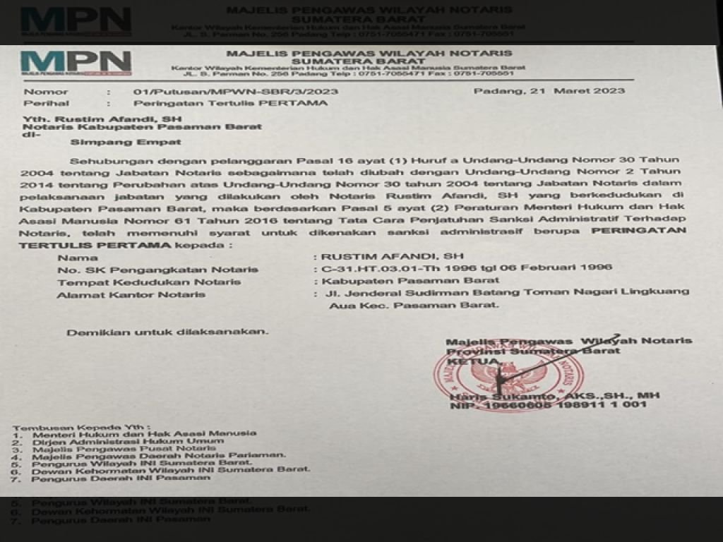 Keputusan tersebut, berdasarkan surat keputusan nomor 01/putusan/MPWN-SBR/3/2023 tanggal 21 Maret 2023 yang di tandatangani oleh Ketua Majelis Pengawas Wilayah Notaris Provinsi Sumatera Barat, Haris Sukamto, AKS, S.H., M.H. yang mana Pelapor/Pengadu dalam perkara dugaan pelanggaran Kode Etik Notaris tersebut Arpan, Hilis Suryani dan Wisno.
