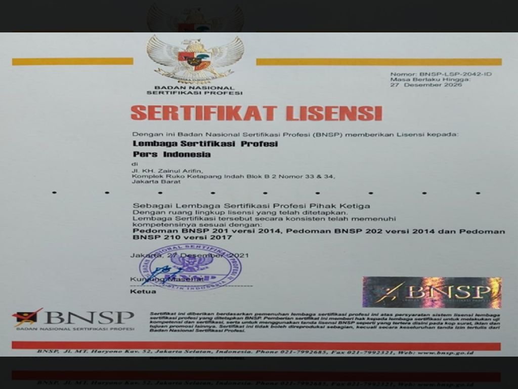 Dikatakan Salim, pelaksanaan Sertifikasi Kompetensi Wartawan (SKP) yang diakui negara adalah LSP Pers Indonesia, karena LSP memiliki legalitas yang diterbitkan lembaga negara yakni BNSP.