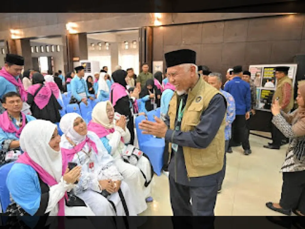 KabaSumbar -- Gubernur Sumatera Barat Mahyeldi Ansharullah resmi melepas 384 calon jamaah haji Kloter 1 Embarkawsi Padang tahun 1447 H/2026 M di Asrama Haji Tabing, Padang, Kamis (23/4/2026). Rombongan pertama ini berasal dari Kota Padang dan dijadwalkan terbang menuju Madinah melalui Bandara Internasional Minangkabau pada Jumat (24/4/2026) dini hari.