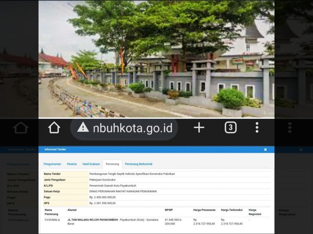 Pasalnya, terkait hasil tender paket Pembangunan Tangki Septik Individu Spesifikasi Kontruksi pabrikan ( Tender Ulang ke 3 ) di Satker Dinas Perumahan Rakyat Kawasan Pemukiman TA. 2023, Pagu dana Rp. 2,4 M, dari penunjukan pemenangnya CV. Kumala, berpotensi sarat KKN dan telah dikondisikan/ diperuntukan buat keuntungan oknum UKPBJ dan di Dinas Perumahan Rakyat Kawasan Pemukiman Kota Payakumbuh.