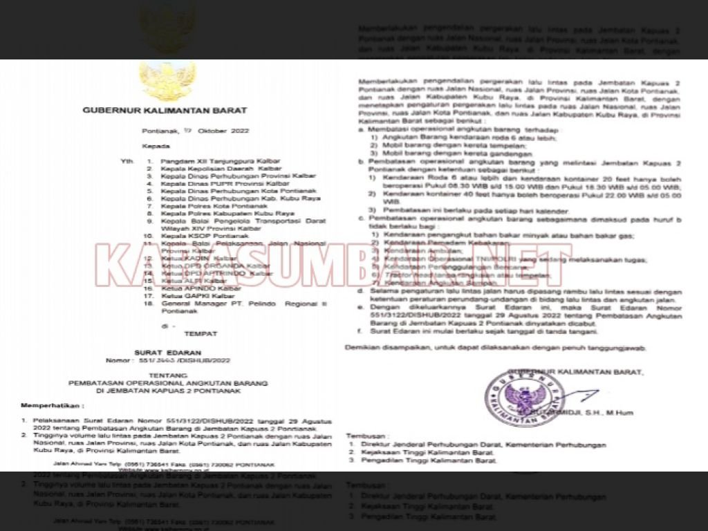 KALBAR | KABASUMBAR.NET – Pembatasan Operasional Angkutan Barang di Jembatan Kapuas 2 Pontianak kembali diatur oleh Pemerintah Provinsi Kalimantan Barat, hal ini tertuang dalam Surat Edaran Gubernur Kalimantan Barat, Nomor: 551/3663/DISHUB/2022, Senin 10 Oktober 2022.