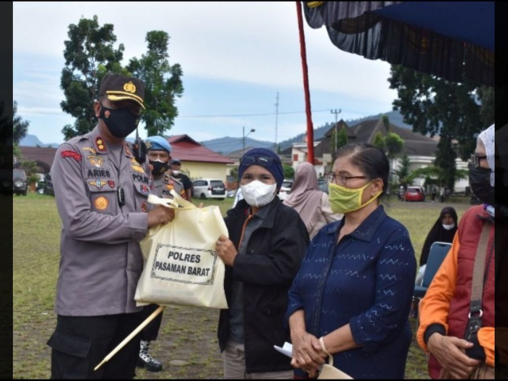 Pasbar | Kaba Sumbar - Saat gelar Gebyar Vaksin Sumdarsin ke tiga titik Kapolres Pasaman Barat Sumatera Barat, AKBP M. Aries Purwanto,. S.I.K., M.M. membagikan 200 paket sembako kepada peserta vaksin lanjut usia di Lapangan MTQ Padang Tujuh, Nagari Aua Kuning, Kecamatan Pasaman, Sabtu (13/11/2021).
