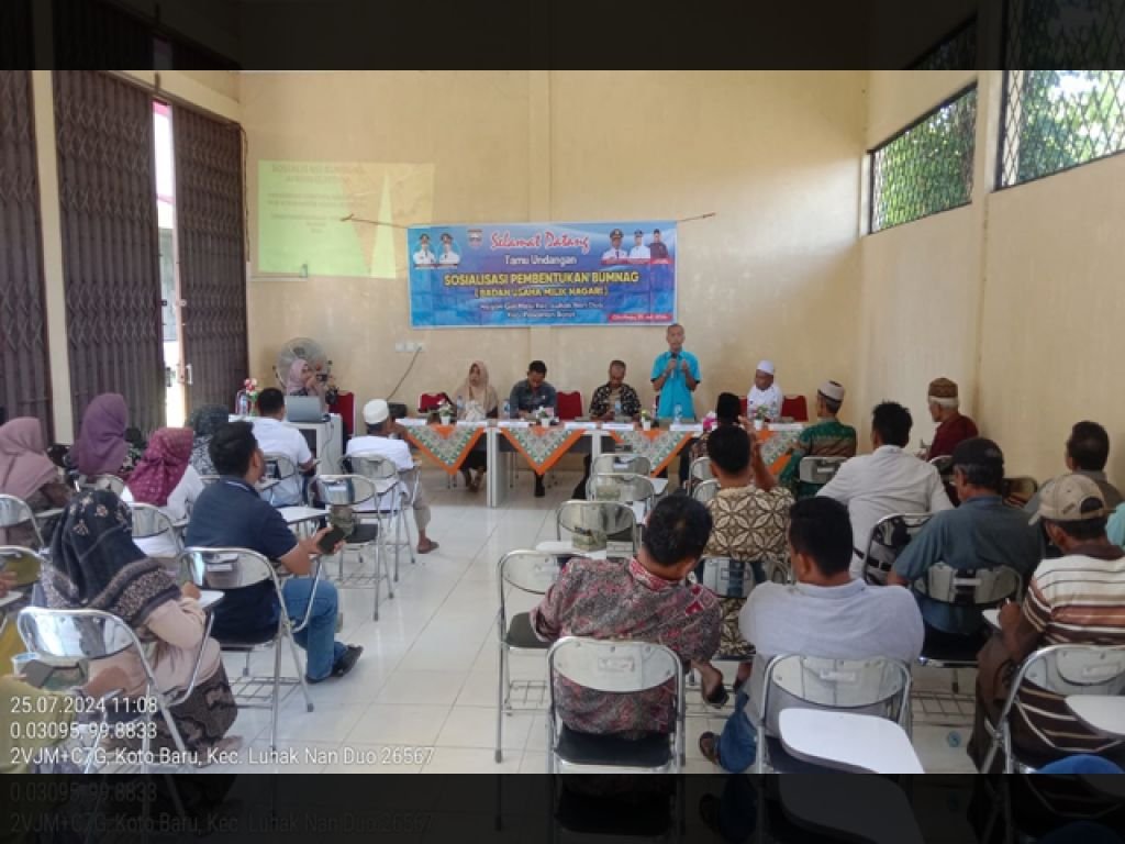 Giri Maju | Kabasumbar.net : Sosialisasi pembentukan Badan Usaha Milik Nagari yang dilaksanakan di Giri Maju tepatnya di Aula UPT BLK kabupaten Pasaman Barat pada hari Kamis, (25/07/2024) yang berlangsung sejak pukul 09.30 Wib. hingga pukul 14.15 wib. terlihat berlangsung sukses, sebab animo masyarakat Nagari Giri Maju sangat tinggi, terutama antusiasme dalam mengikuti sosialisasi tersebut yang berakhir dengan kesepakatan untuk membentuk Bumnag.